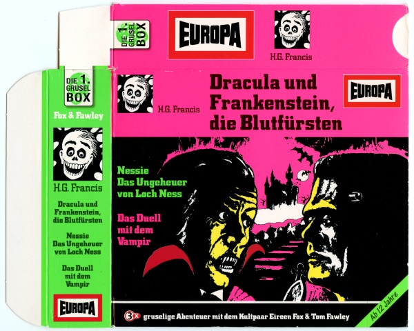 Die 1. Gruselbox CD: Schuber, Rückseite Format: Papier, 14,4 cm × 12,7 cm × 3,2 cm Zeitraum: 2006 Info: Drei CDs (Dracula und Frankenstein, die Blutfürsten, Nessie - Das Ungeheuer von Loch Ness, Das Duell mit dem Vampir) als Nachauflagen im Schuber, mit dem Schriftzug "3 gruselige Abenteuer mit dem Kultpaar Eireen Fox & Tom Fawley". Der Spruch "Die Grusel 3er-Boxen und auch die Produkte endlich wieder in Neonfarben!" erscheint rätselhaft: welche "Produkte"? |
