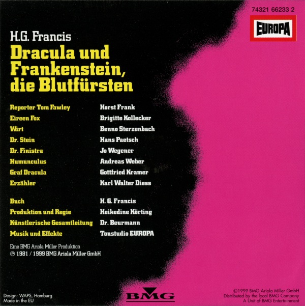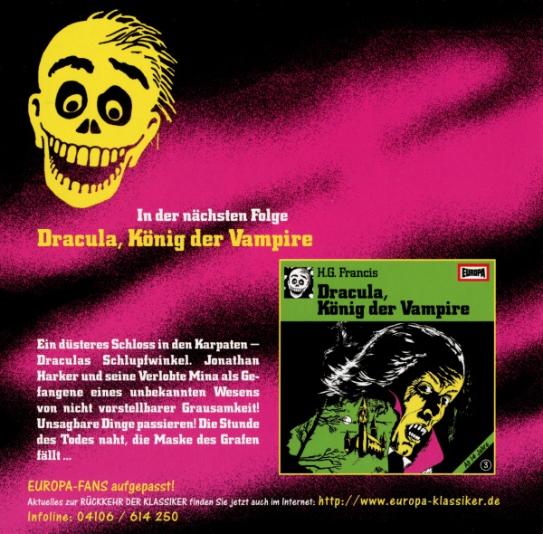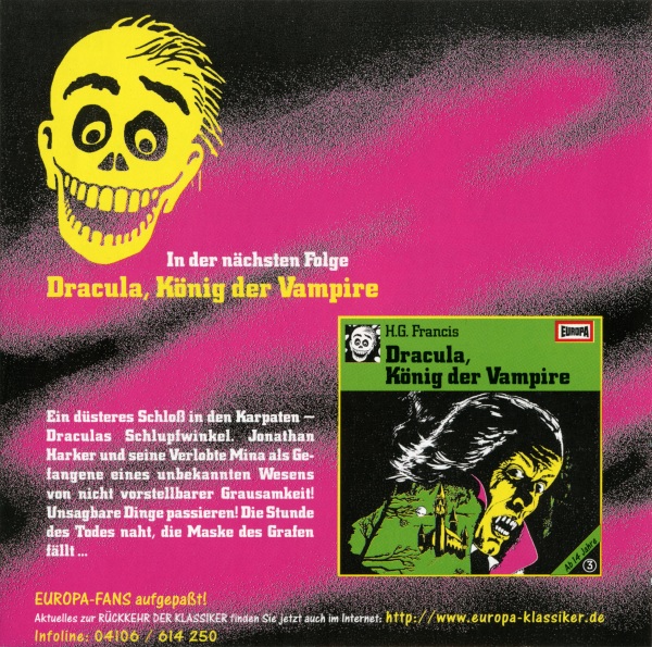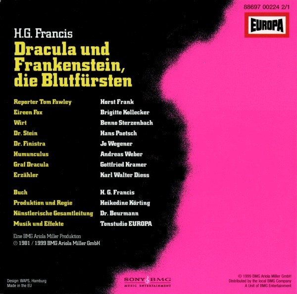 Dracula und Frankenstein, die Blutfürsten (2) Neuausgabe 99/00 / Nachauflage 06 CD: Inlay, Außenseite Format: Papier, 15,1 cm × 11,8 cm Zeitraum: 2006 Info: Nachauflage in Die 1. Gruselbox. Verwechslungsgefahr mit der Neuausgabe von 1999 - achtet auf das knalligere Pink, die dunkleren schwarzen Schatten im Hintergrund, den schwarzen schrägen Streifen mit weißer Schrift, den fehlenden Strichcode und das neue SONY BMG-Logo! Außerdem anders: neue Katalognummer, schmalere Ellipse rund um den Label Code, Inhaltsangabe in neuer Rechtschreibung. |
