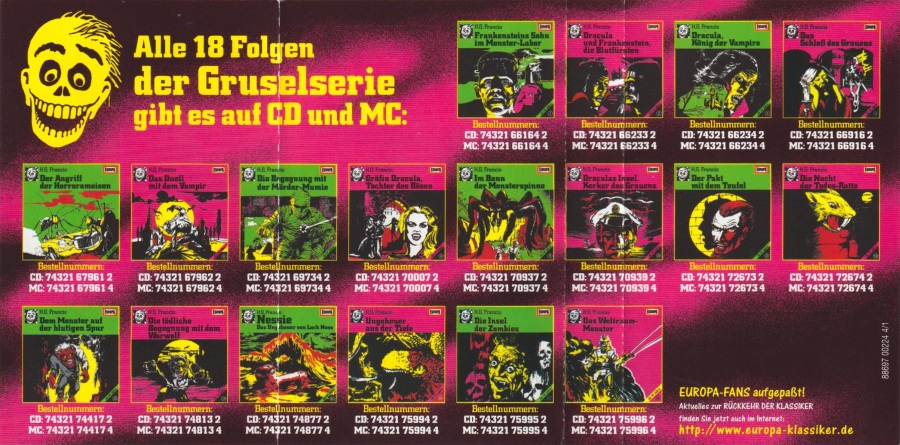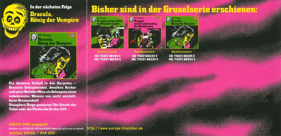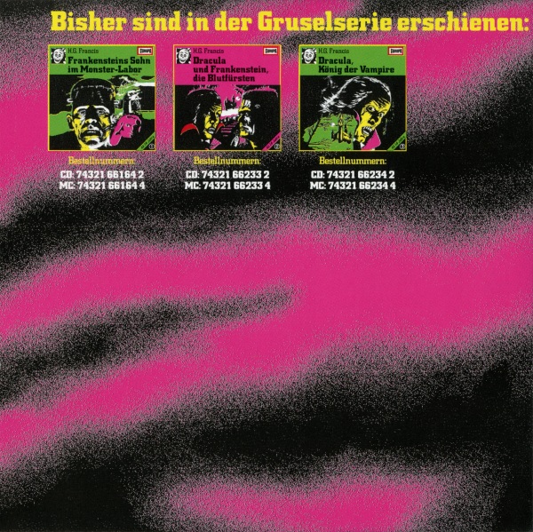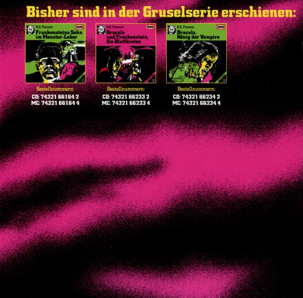 Dracula und Frankenstein, die Blutfürsten (2) Neuausgabe 99/00 / Nachauflage 06 MC-Einleger: Außenseite Format: Papier, ??,? cm × ??,? cm Zeitraum: 2006 Info: Nachauflage in Die 1. Gruselbox. Verwechslungsgefahr mit der Neuausgabe von 1999 - achtet auf die neue Katalognummer am MC-Rücken und darauf, daß auf der Rückseite des Einlegers der Strichcode fehlt. Die Altersempfehlung "Ab 14 Jahre", der Pink-Farbton, der gelbe schräge Streifen mit schwarzer Schrift und das BMG-Logo wurden (anders als bei der CD-Nachauflage) nicht verändert. |