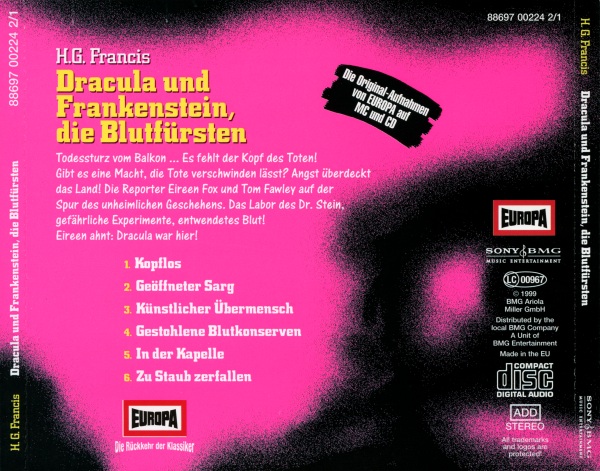 Dracula und Frankenstein, die Blutfürsten (2) Neuausgabe 99/00 / Nachauflage 06 CD: Booklet, Seite 4 Format: Papier, 12,1 cm × 11,9 cm Zeitraum: 2006 Info: Nachauflage in Die 1. Gruselbox. Auf dieser Seite des Booklets wurden einige Veränderungen gegenüber der Neuausgabe von 1999 vorgenommen: knalligeres Pink, neue Katalognummer über dem EUROPA-Logo, das weiße Ⓟ-Zeichen ist nicht mehr fettgedruckt, in der Fußzeile steht in der Mitte das neue SONY BMG-Logo und der Text links und rechts hat die Schriftart gewechselt. |