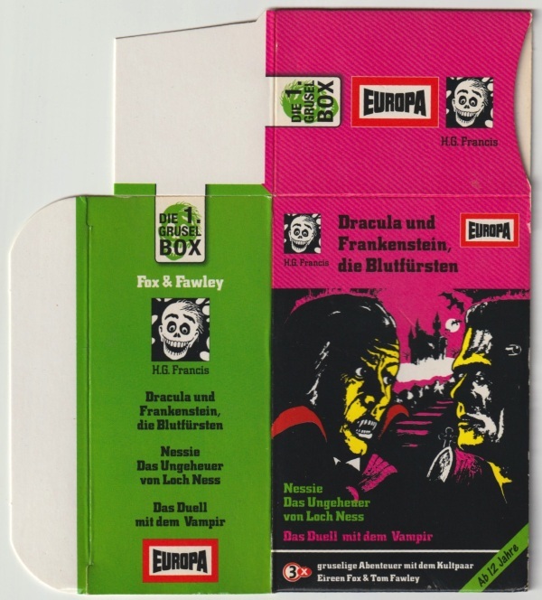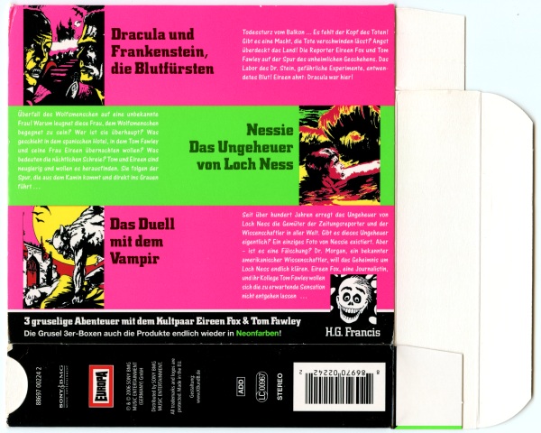 Die 1. Gruselbox CD: Schuber, Rückseite Format: Papier, 14,4 cm × 12,7 cm × 3,2 cm Zeitraum: 2006 Info: Drei CDs (Dracula und Frankenstein, die Blutfürsten, Nessie - Das Ungeheuer von Loch Ness, Das Duell mit dem Vampir) als Nachauflagen im Schuber, mit dem Schriftzug "3 gruselige Abenteuer mit dem Kultpaar Eireen Fox & Tom Fawley". Der Spruch "Die Grusel 3er-Boxen und auch die Produkte endlich wieder in Neonfarben!" erscheint rätselhaft: welche "Produkte"? |