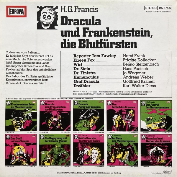 Dracula und Frankenstein, die Blutfürsten (2) Erstausgabe 81 LP: Matrix in der Auslaufrille, Seite 1 und Seite 2 Bekannte Kombinationen von Matrizen: (P)1981 115 675.6 A-I || (P)1981 115 675.6 B-I Zeitraum: 1981 [und 1982?]