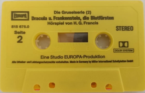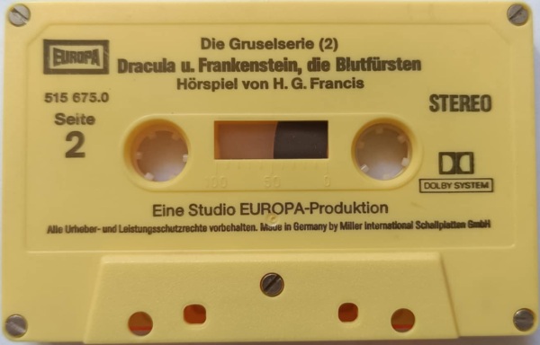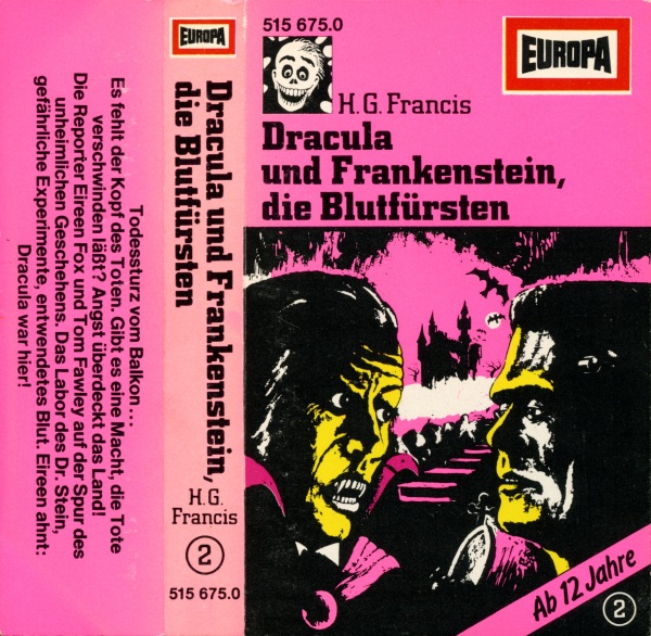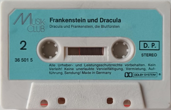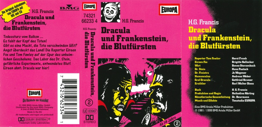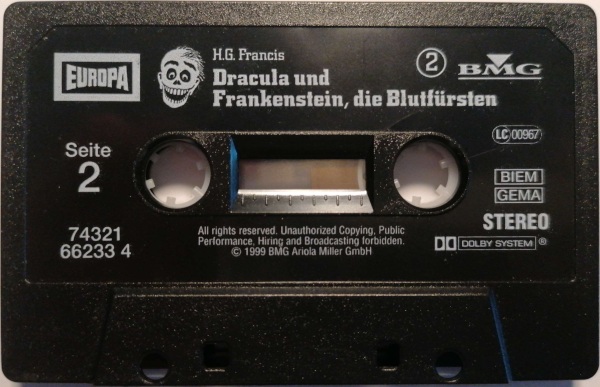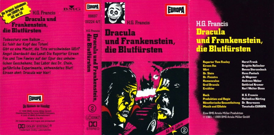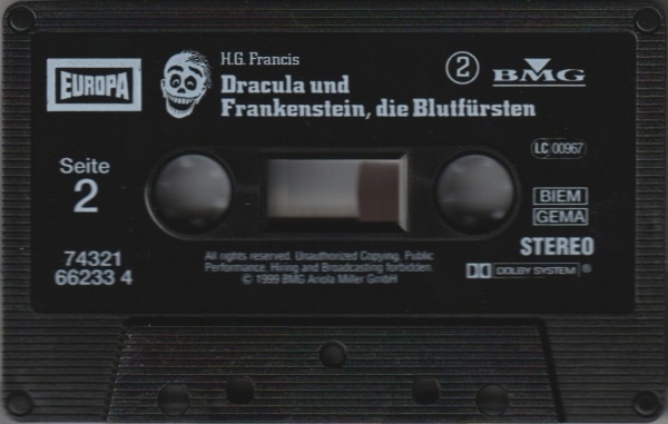 Dracula und Frankenstein, die Blutfürsten (2) Neuausgabe 99/00 MC, Seite 2 Format: Kompaktkassette; schwarzes Kunststoffgehäuse, weiß bedruckt (ohne Aufkleber) Zeitraum: 1999[-200x]