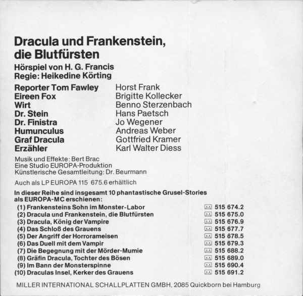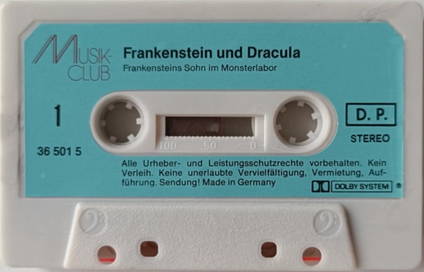 Frankenstein und Dracula Lizenzausgabe MC-Einleger: Innenseite Format: Papier, 10,3 cm × 10,1 cm Zeitraum: 1982 (oder 1981) Info: Variationen sind bislang nicht bekannt. |