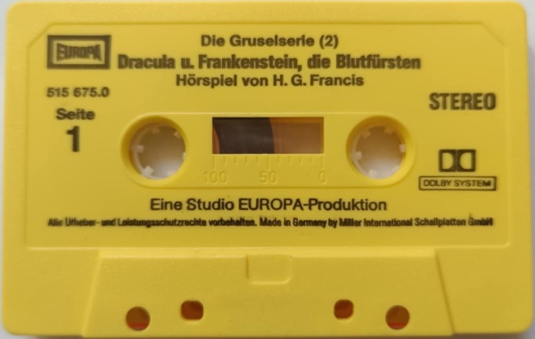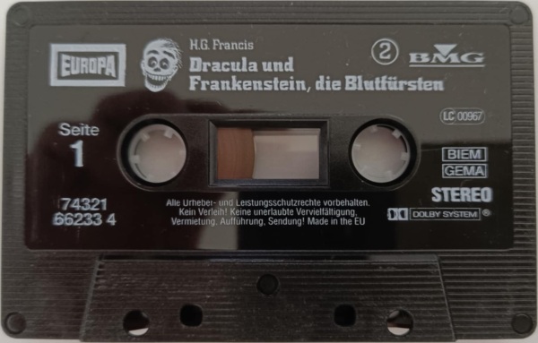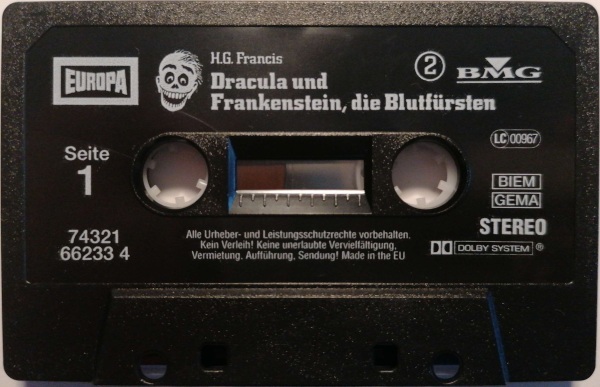 Dracula und Frankenstein, die Blutfürsten (2) Neuausgabe 99/00 MC, Seite 1 Format: Kompaktkassette; schwarzes Kunststoffgehäuse, weiß bedruckt (ohne Aufkleber) Zeitraum: 1999[-200x]