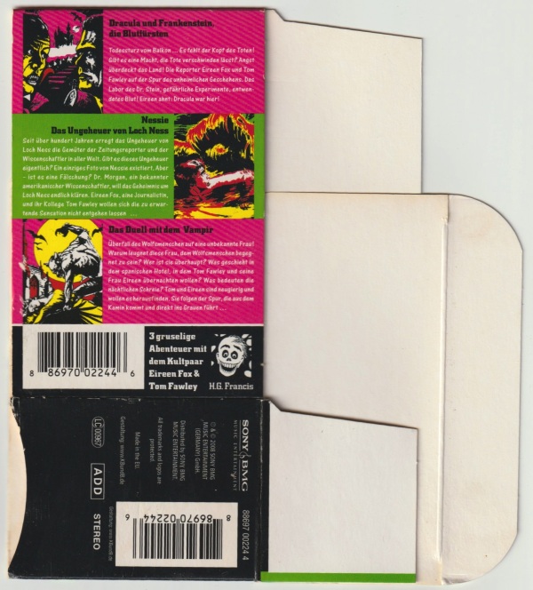 Die 1. Gruselbox MC: Schuber, Rückseite Format: Papier, ??,? cm × ??,? cm × ??,? cm Zeitraum: 2006 Info: Drei MCs (Dracula und Frankenstein, die Blutfürsten, Nessie - Das Ungeheuer von Loch Ness, Das Duell mit dem Vampir) als Nachauflagen im Schuber, mit dem Schriftzug "3 gruselige Abenteuer mit dem Kultpaar Eireen Fox & Tom Fawley". |