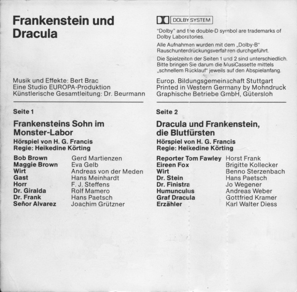 Frankenstein und Dracula Lizenzausgabe MC-Einleger: Außenseite Format: Papier, 10,3 cm × 10,1 cm Zeitraum: 1982 (oder 1981) Info: Doppelfolge (Seite 1: Frankensteins Sohn im Monster-Labor, Seite 2: Dracula und Frankenstein, die Blutfürsten) als Lizenzausgabe. In gleicher Aufmachung erschienen u.a. Doppelfolgen von Die drei ??? (Folge 1 und 2) und Hui Buh. Variationen sind bislang nicht bekannt. |