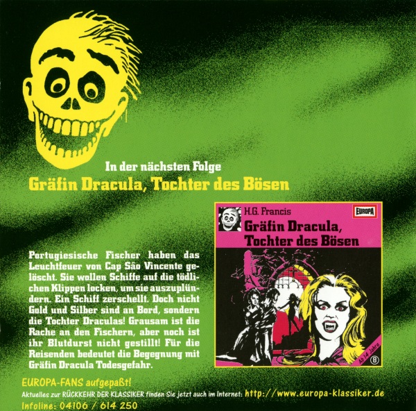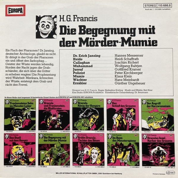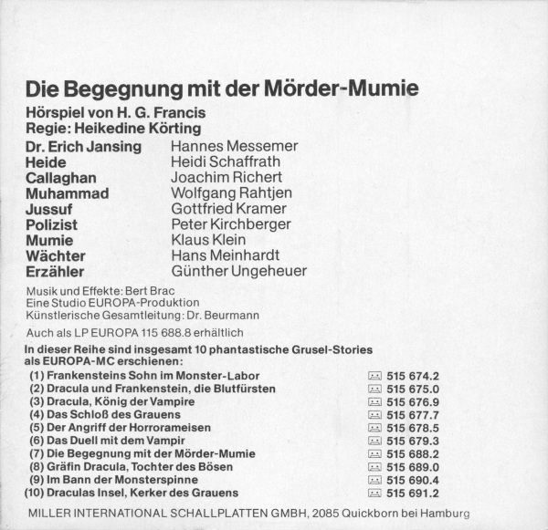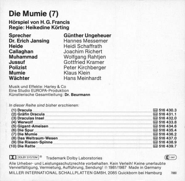 Die Begegnung mit der Mörder-Mumie (7) Erstausgabe 81 LP: Schallplattenhülle, Rückseite Format: Karton / Pappe, 31 cm × 31 cm Zeitraum: 1981 [und 1982?] Info: Variationen sind bislang nicht bekannt.