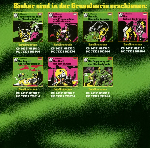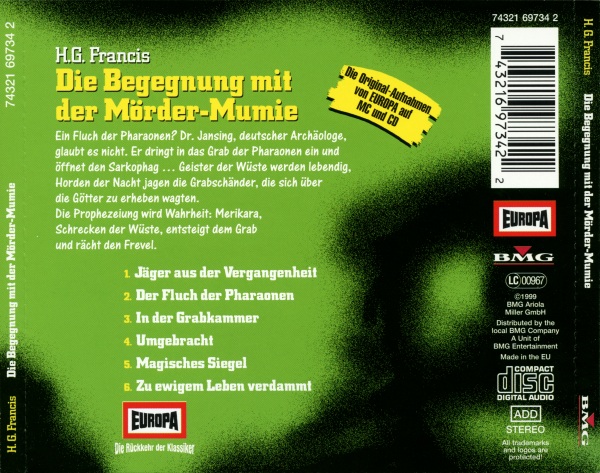 Die Begegnung mit der Mörder-Mumie (7) Neuausgabe 99/00 CD: Inlay, Außenseite Format: Papier, 15,1 cm × 11,8 cm Zeitraum: 1999[-200x] Info: Variationen sind bislang nicht bekannt. |
