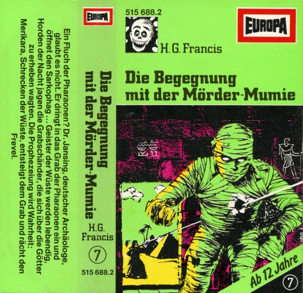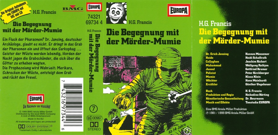 Die Begegnung mit der Mörder-Mumie (7) Neuausgabe 99/00 MC-Einleger: Außenseite Format: Papier, ??,? cm × ??,? cm Zeitraum: 1999[-200x] Info: Variationen sind bislang nicht bekannt.