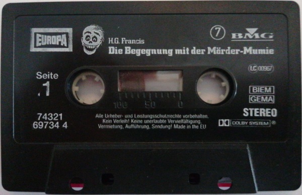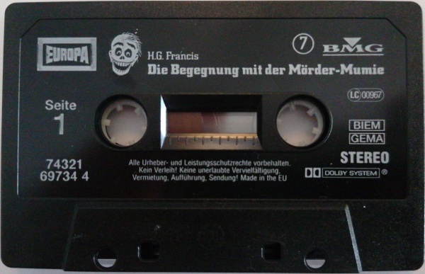 Die Begegnung mit der Mörder-Mumie (7) Neuausgabe 99/00 MC, Seite 1 Format: Kompaktkassette; schwarzes Kunststoffgehäuse, weiß bedruckt (ohne Aufkleber) Zeitraum: 1999[-200x] Info: Gehäuse ohne Schrauben mit höherem Sichtfenster. |