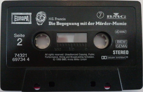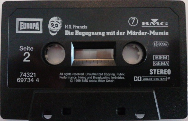 Die Begegnung mit der Mörder-Mumie (7) Neuausgabe 99/00 MC, Seite 2 Format: Kompaktkassette; schwarzes Kunststoffgehäuse, weiß bedruckt (ohne Aufkleber) Zeitraum: 1999[-200x] Info: Gehäuse ohne Schrauben mit höherem Sichtfenster. |